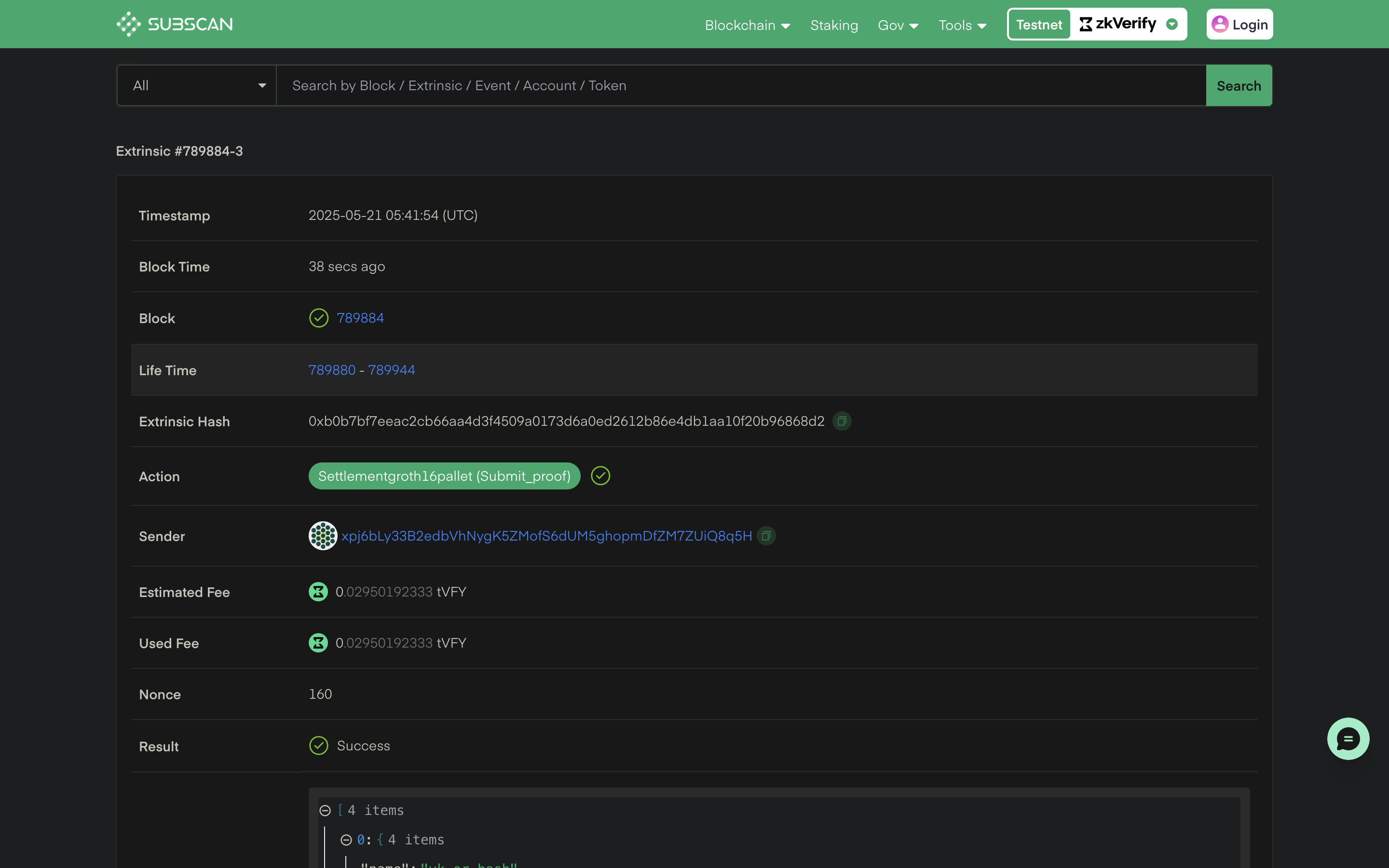 You can check your verified proof on our zkVerify Explorer using the txHash logged.