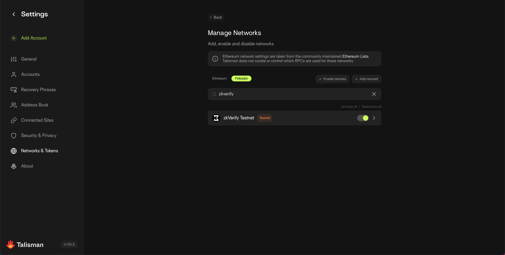 5. Search for "zkVerify Testnet" and activate using the toggle.