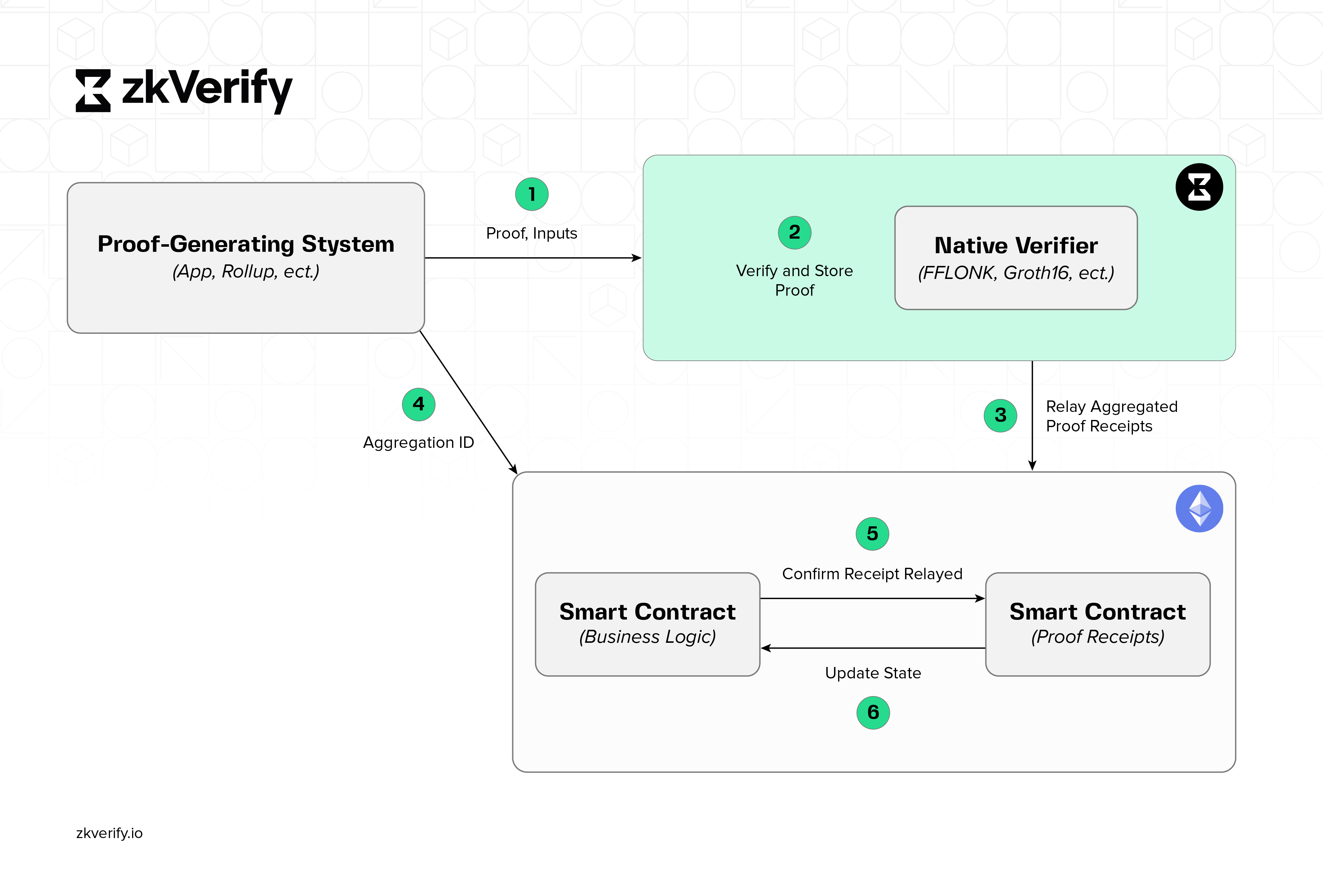The figure below demonstrates one possible integration of zkVerify into a typical ZK application flow. The responsibility of verifying proofs has been delegated entirely to zkVerify, and only aggregations (small hashes) are ever stored on the settlement chain.